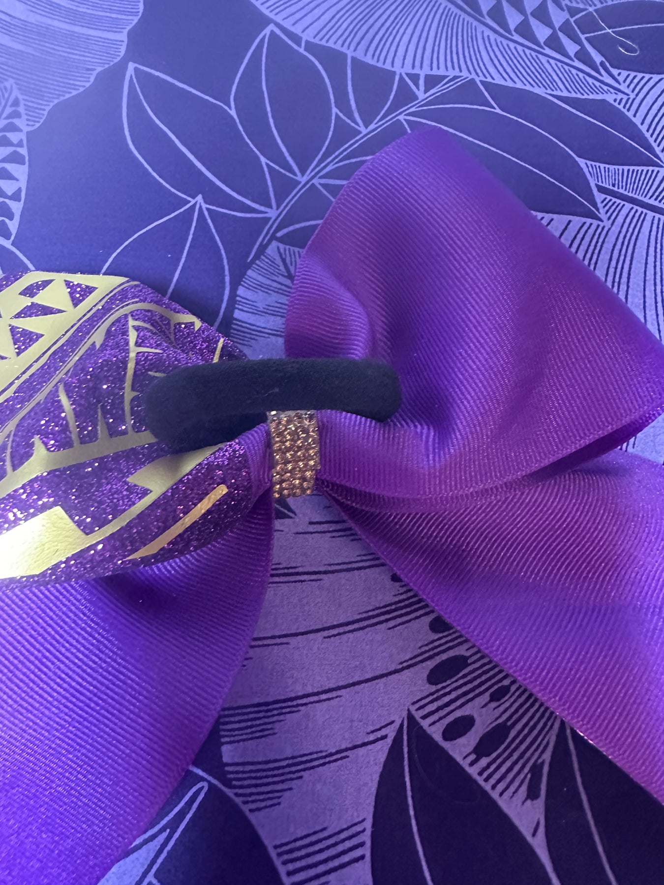 This purple grosgrain hair bow is all about being real cute with a touch of island pride! Half the bow is accented in rich purple glitter with a gold Polynesian tribal design with the rhinestone center makes this bow really pop! It’s perfect for cheer, playing ball, or adding a perfect accent to a perfect outfit.